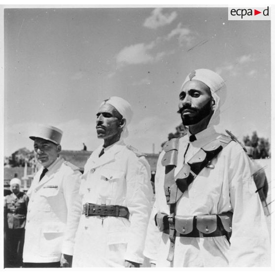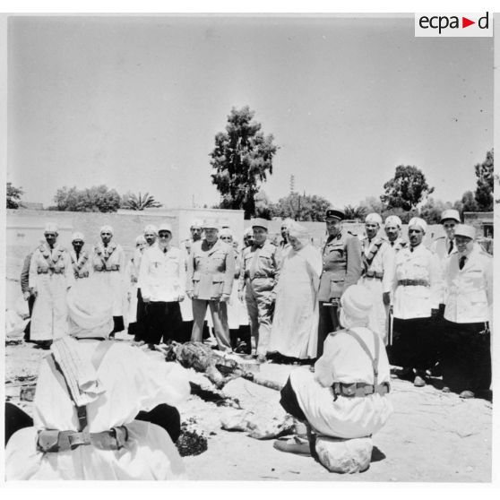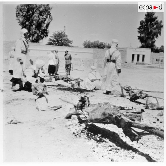 Des soldats participent à un méchoui, en compagnie du général Vanuxem.