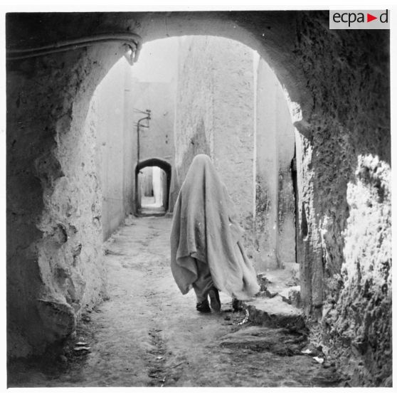 Une femme, de dos, dans une rue.