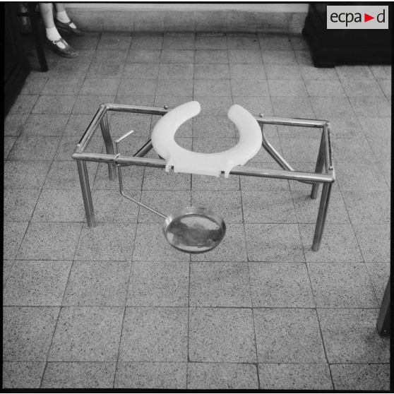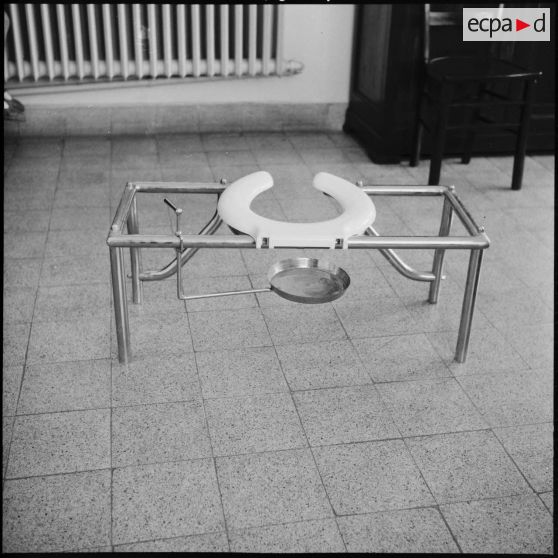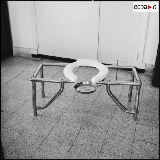 Tirages recadrés d'un WC mobile à l'hôpital Maillot. Il permet de recueillir les excréments du patient.