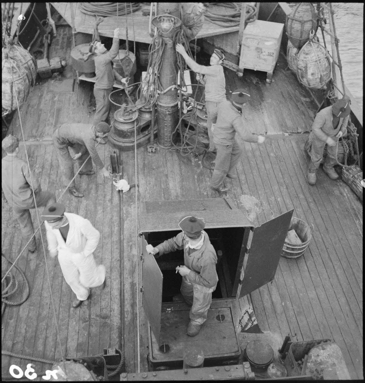 Vue en plongée sur l'équipage qui évolue sur la plage avant du chalutier de la marine marchande Roche noire, réquisitionné et armé par la Marine nationale comme dragueur de mines auxiliaire.