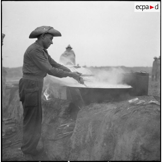 Les cuisines du 69e régiment d'artillerie d'Afrique (69e RAA) sur le bivouac à Luc Nam.