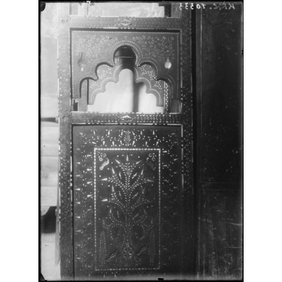 [Vue intérieure d'une église : une fresque au dessus d'une porte sculptée.]
