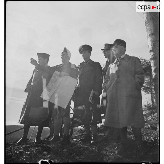 Un groupe d'officiers dont l'un tient une carte à la main observe l'horizon. Parmi eux, se trouve un officier britannique ou américain.