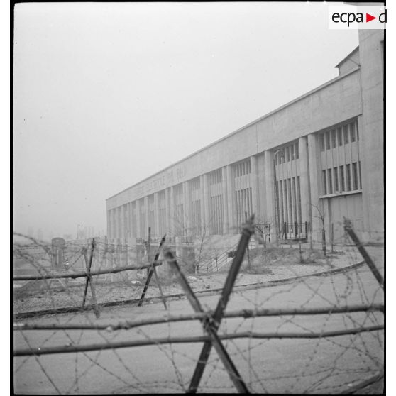Vue extérieure de la centrale électrique de Kembs "Energie électrique du Rhin", ceinte d'un réseau de fils de fer barbelés. Vue intérieure d'une salle des machines sans personnel.