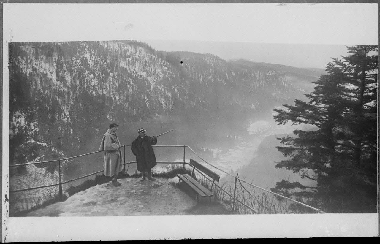 Altenberg (est de La Schlucht). Le président Poincaré, les présidents du Sénat et de la Chambre des députés MM. Dubost et Deschanel, devant l'entrée de l'hôtel de l'Altenberg.