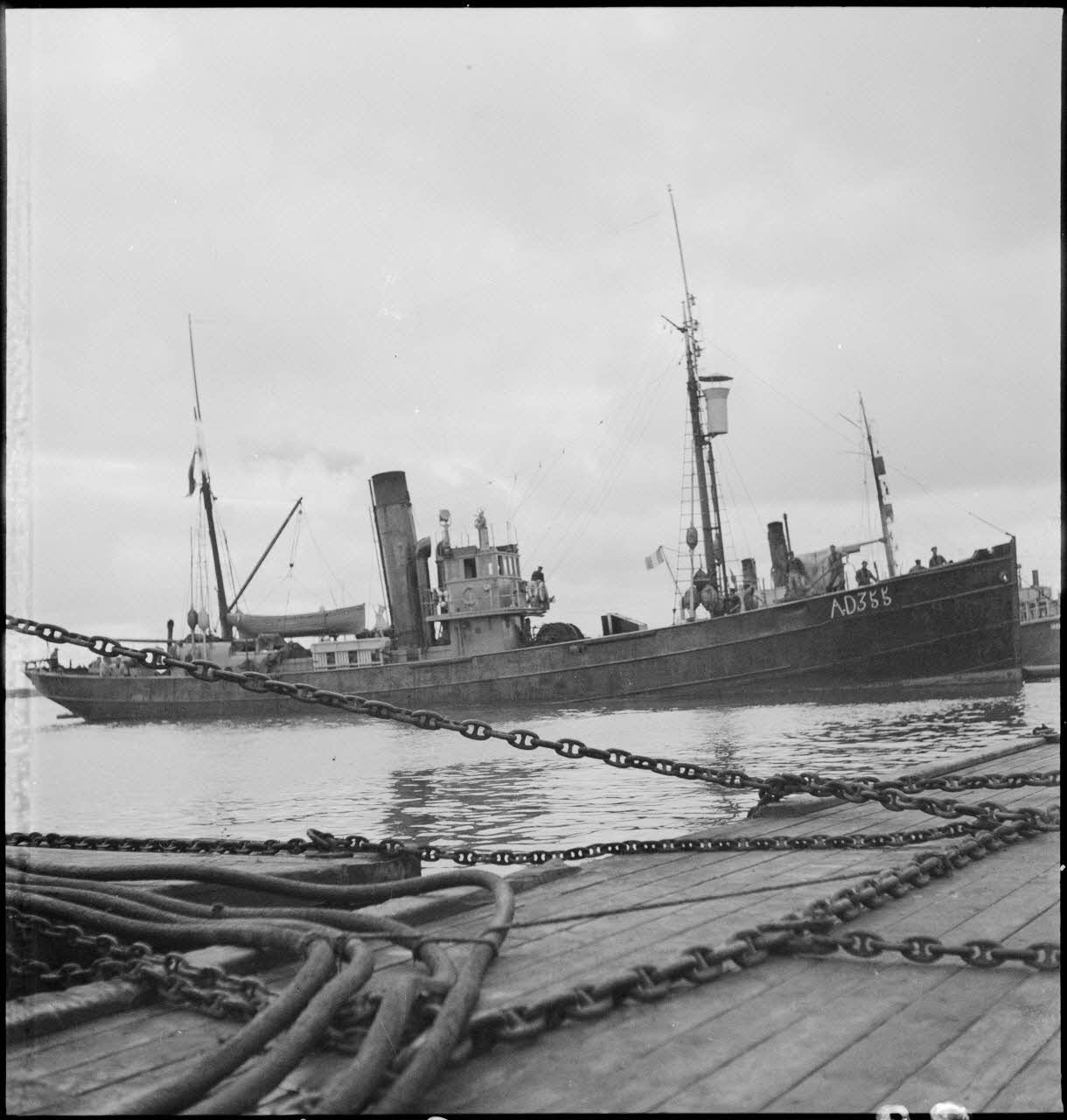 Vue tribord du chalutier de la marine marchande Roche noire, numéro de coque AD 355, réquisitionné et armé par la Marine nationale en août 1939 pour servir comme dragueur de mines auxiliaire.