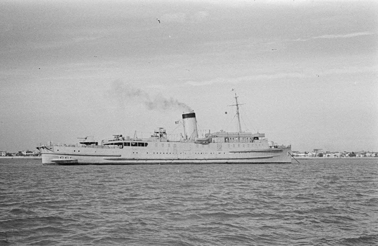 Une barque et ses passagers sont montés à bord du mouilleur de mines Ostmark.