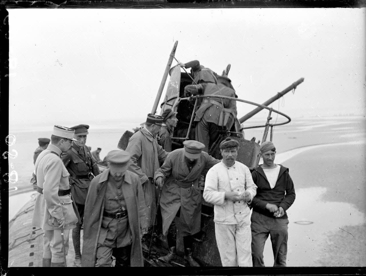 Le sous-marin allemand UC-61, détruit par son propre équipage au moment de s'échouer sur les côtes françaises, repose sur la plage devant Wissant, à marée basse. Des douaniers du poste de Wissant gardent le bateau (1). Des marins français et des officiers britanniques et français viennent inspecter l'épave.
