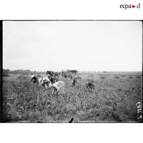 Des femmes battent le blé, arrachent les pommes de terre, ramassent des haricots ; un vieux faucheur a repris du service dans l'agriculture pour la durée de la guerre.