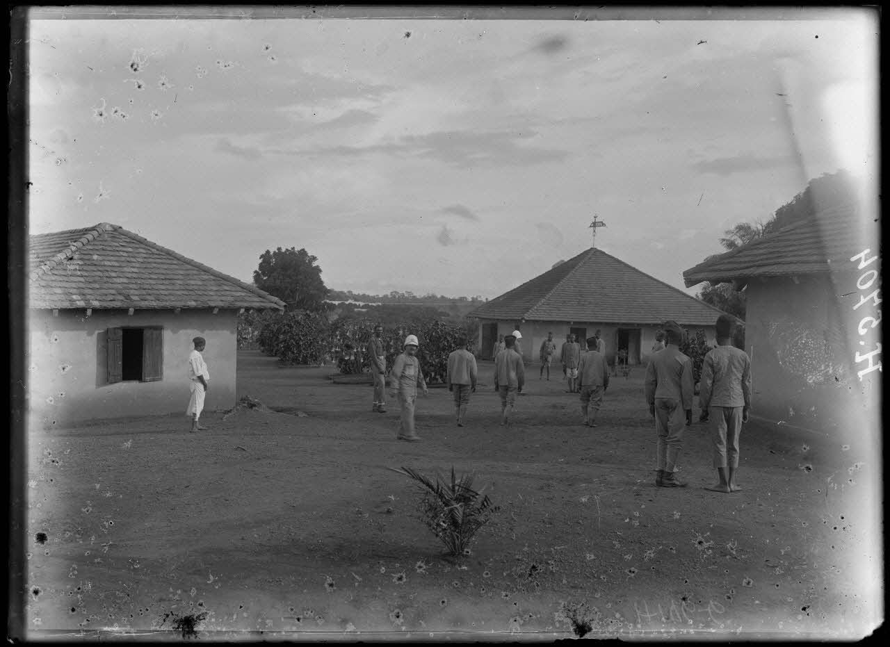 A Yaoundé, vue des pavillons de l'hôpital indigène, devant lesquels se tiennent des tirailleurs.