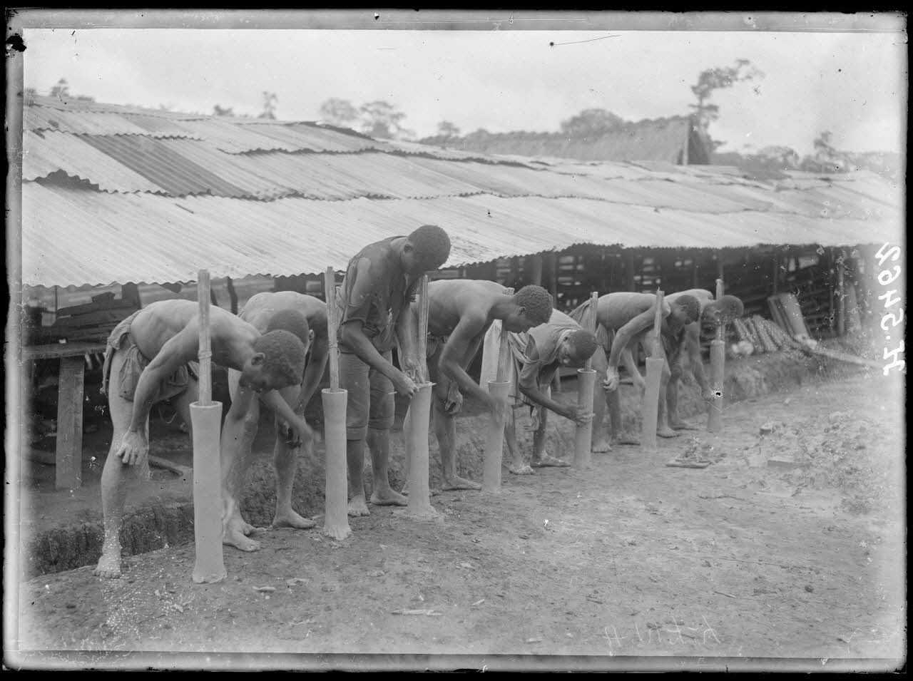 Yaoundé.La briqueterie. Fabrication de tuyautages. [légende d'origine]