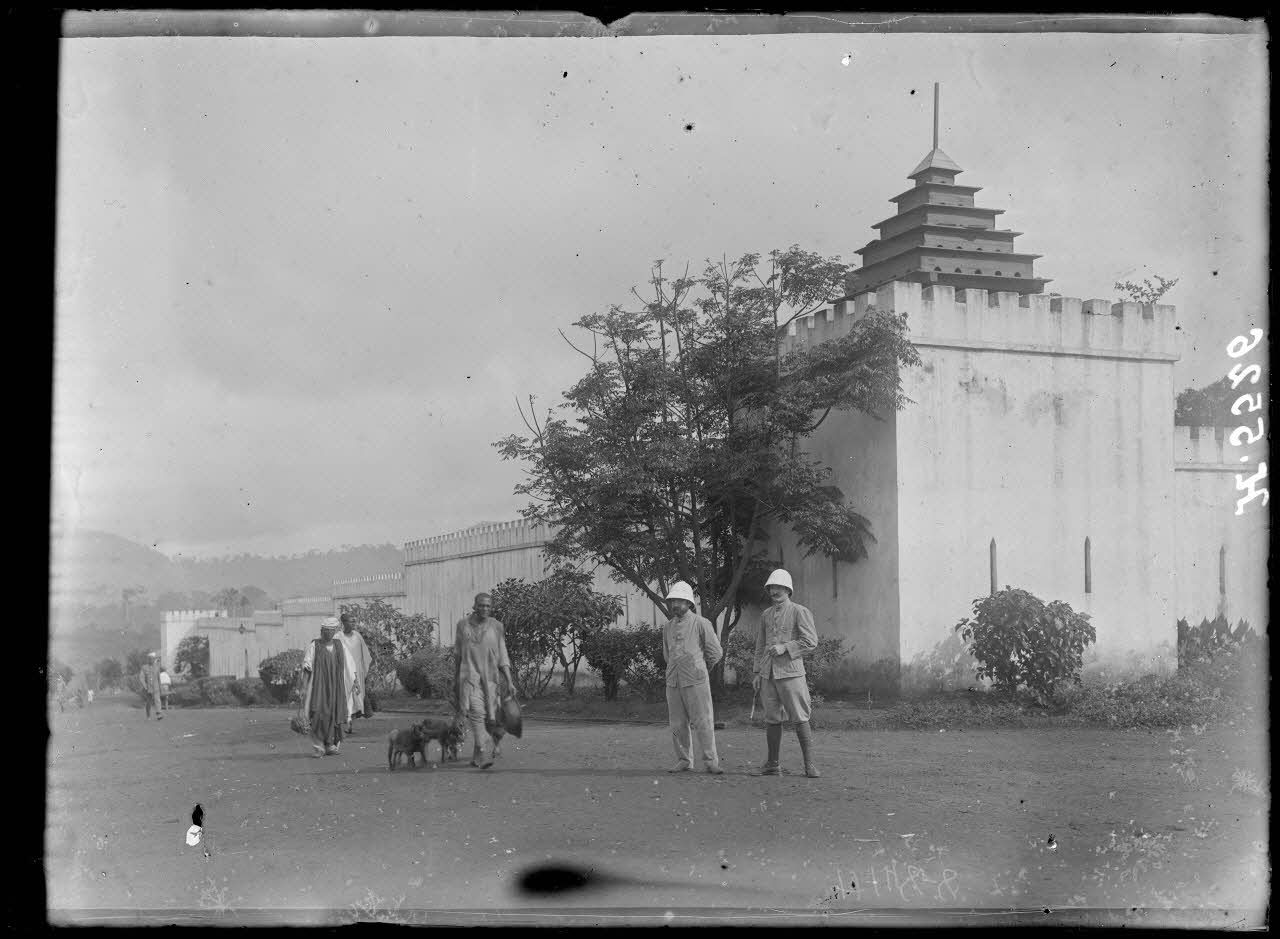 A Yaoundé, vue du mur d'enceinte et de la tour du poste militaire, avec deux officiers et des habitants.