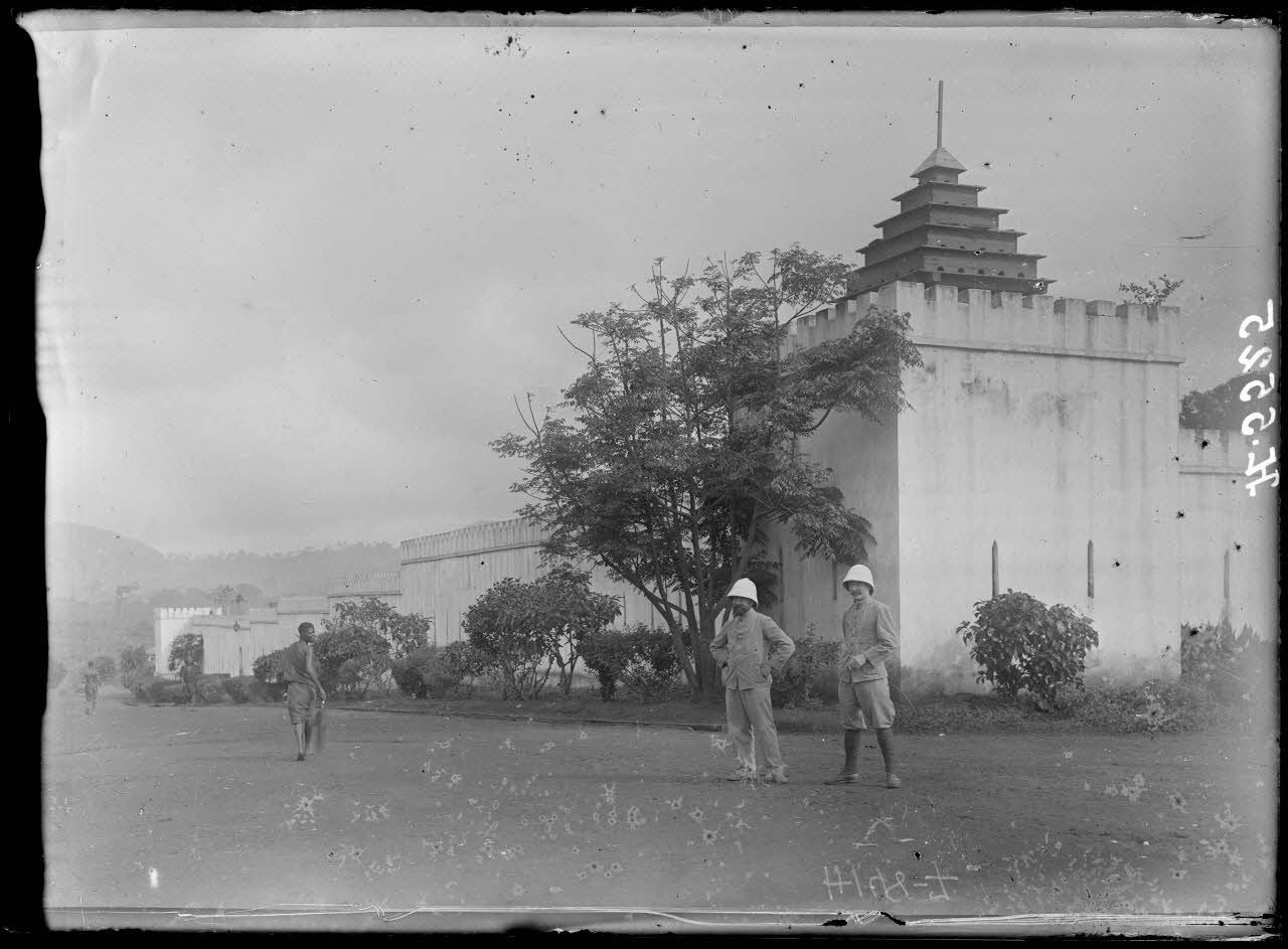 A Yaoundé, vue du mur d'enceinte et de la tour du poste militaire, avec deux officiers.