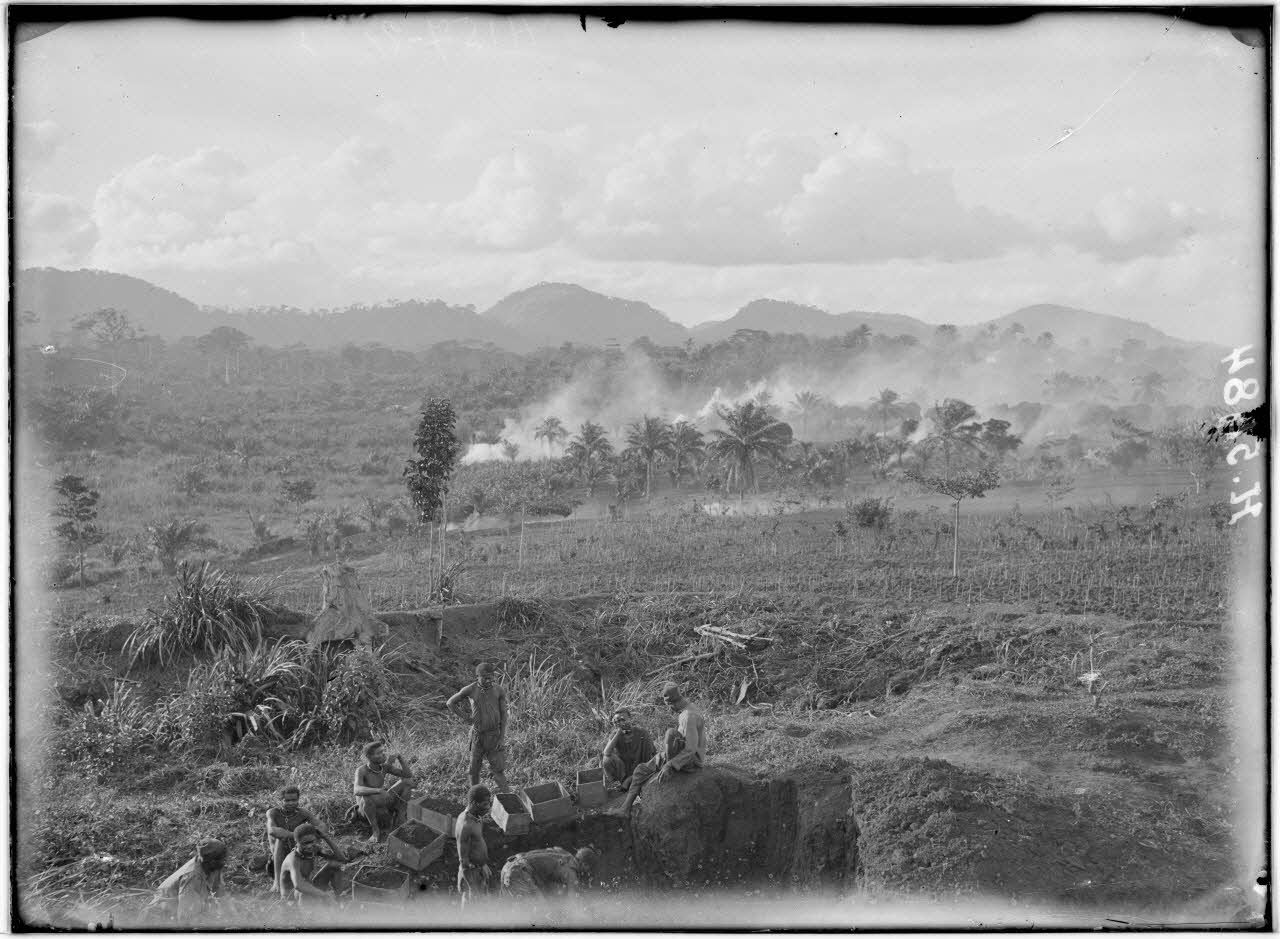 Vue générale du paysage de collines au sud-ouest de Yaoundé, où a lieu un feu de brousse. Au premier plan, des Camerounais creusent une excavation.