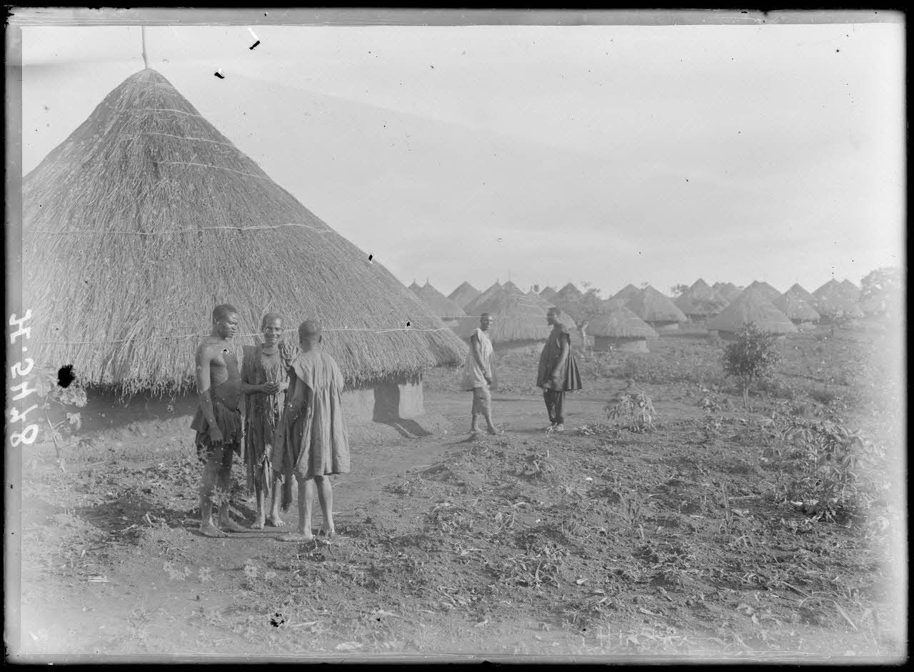 Des hommes en tuniques se tiennent devant les cases du village Babouté de Yoko.