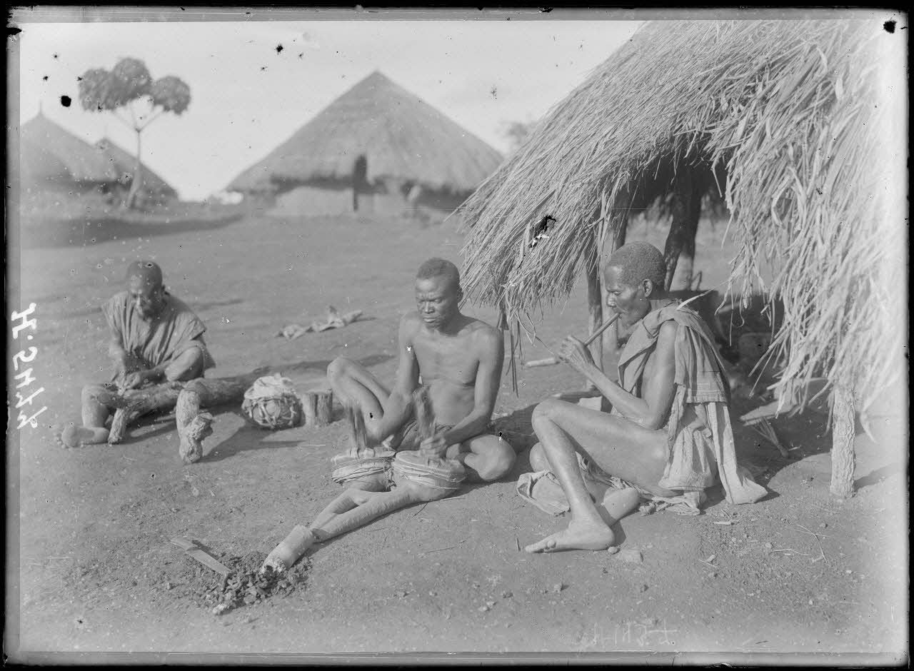 Yoko, au village haoussa, un forgeron attise le feu avec un soufflet, assis à l'entrée d'une case.