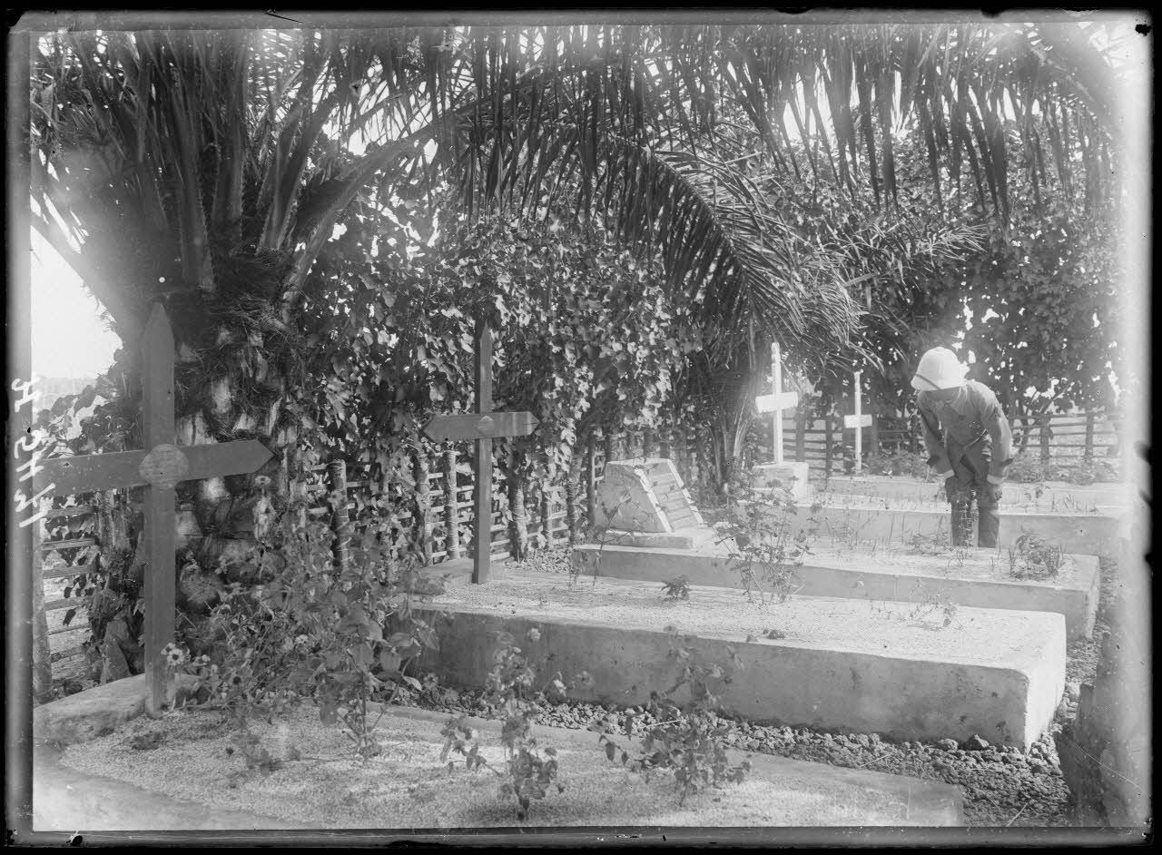 Un officier se penche sur une tombe du cimetière européen de Yoko, ombragé par des palmiers.