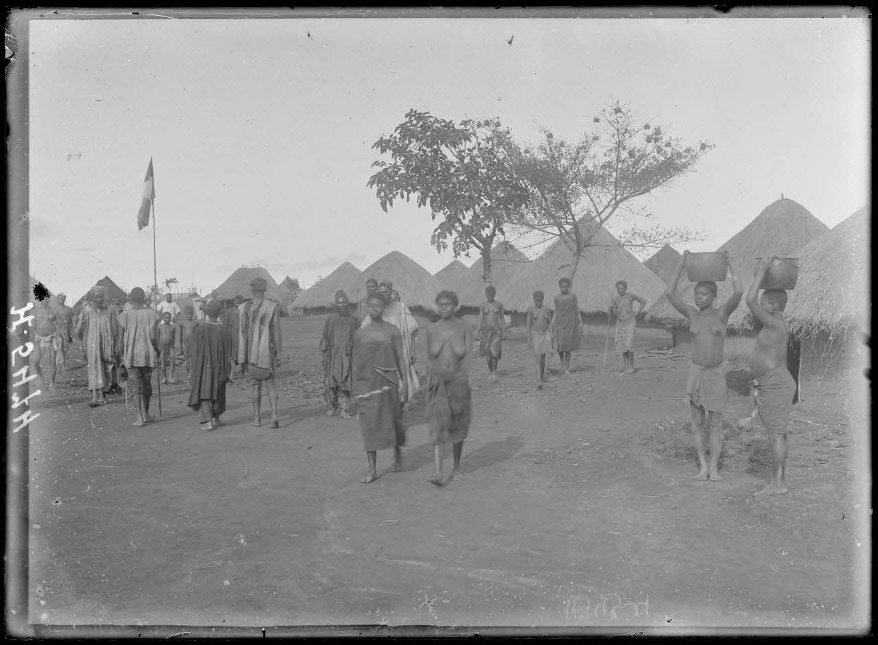 A Yoko, les habitants du village Babouté se tiennent sur une place, tenant un drapeau. Deux femmes portent des marmites sur leur tête.