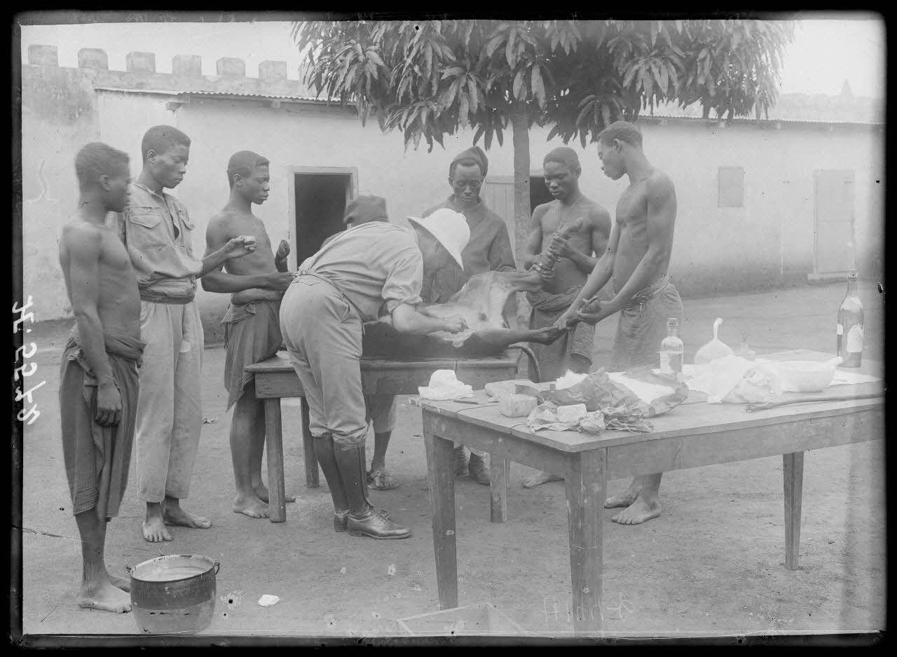Au poste militaire de Yoko, un médecin prélève la lymphe d'un animal auquel on a inoculé la variole, afin de fabriquer des doses de vaccin. Des tirailleurs et des indigènes maintiennent la bête sur une table.