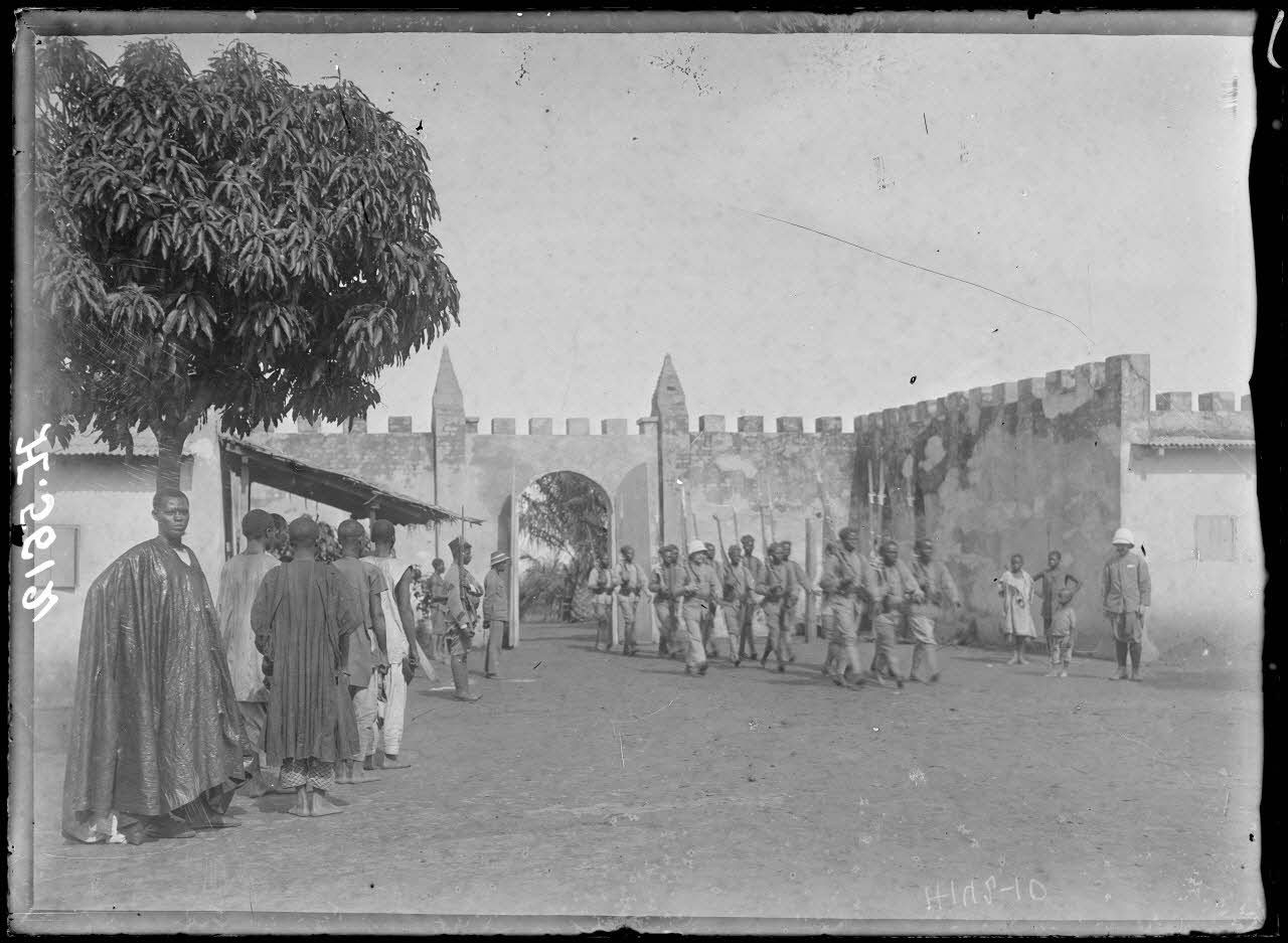 Un groupe de tirailleurs franchit la porte du poste militaire de Yoko sous les yeux de quelques habitants et d'un officier.