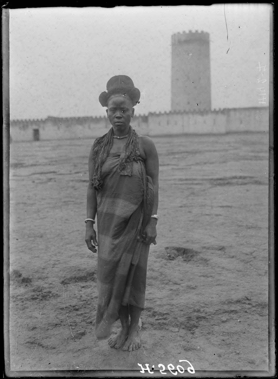 Une femme Haoussa à la coiffure compliquée pose devant le fort militaire de Yoko.