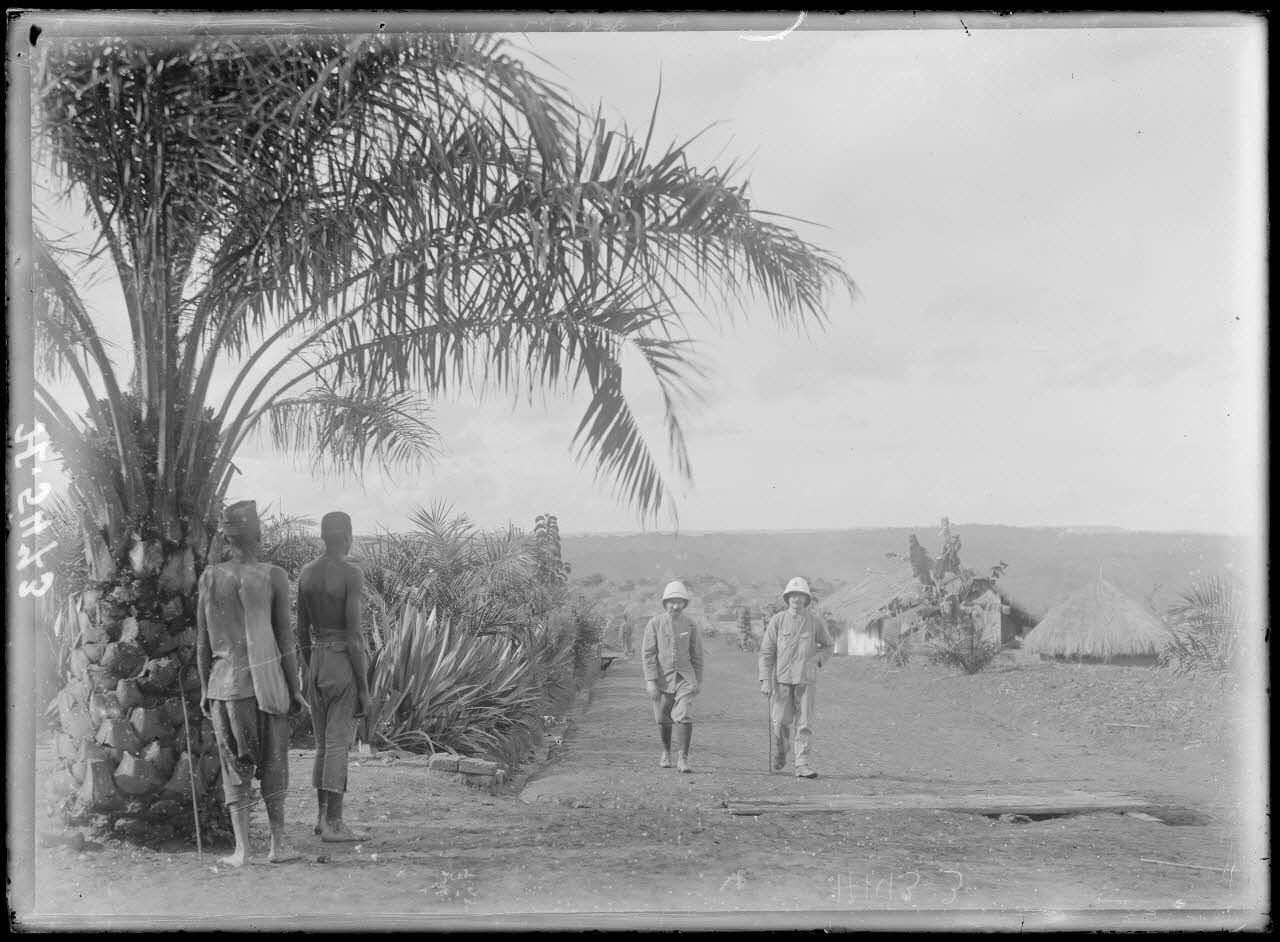 Deux officiers marchent sur la route, au village Haoussa de Yoko, tandis que deux tirailleurs s'abritent du soleil sous un palmier. La route est bordée d'une plate-bande de plantes tropicales déciratives.