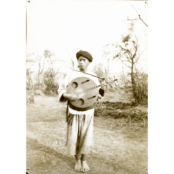 Yunnan méridional. Population aborigène. Jeune indigène de la campagne jouant de la guitare.