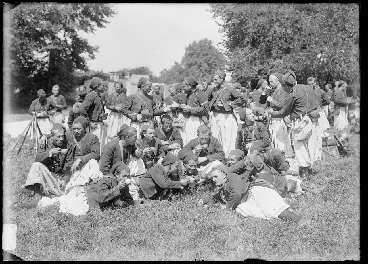 Zouave - La grande halte pendant la manœuvre, les soldats boivent dans des tasses en fer blanc. [légende d'origine du cliché D146-1-2]
