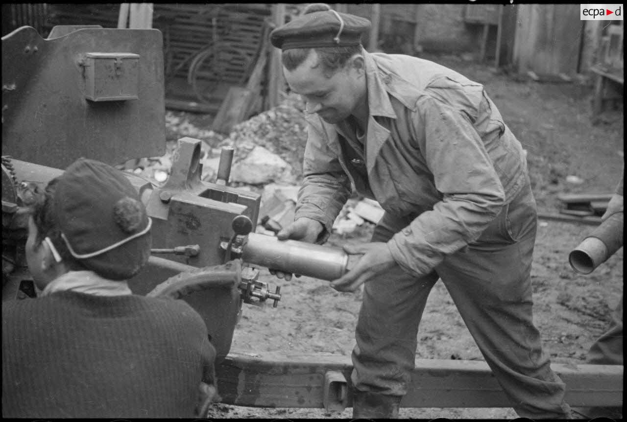 - Fusiliers marins chargeant un obus dans un canon anti-char de 25 mm.