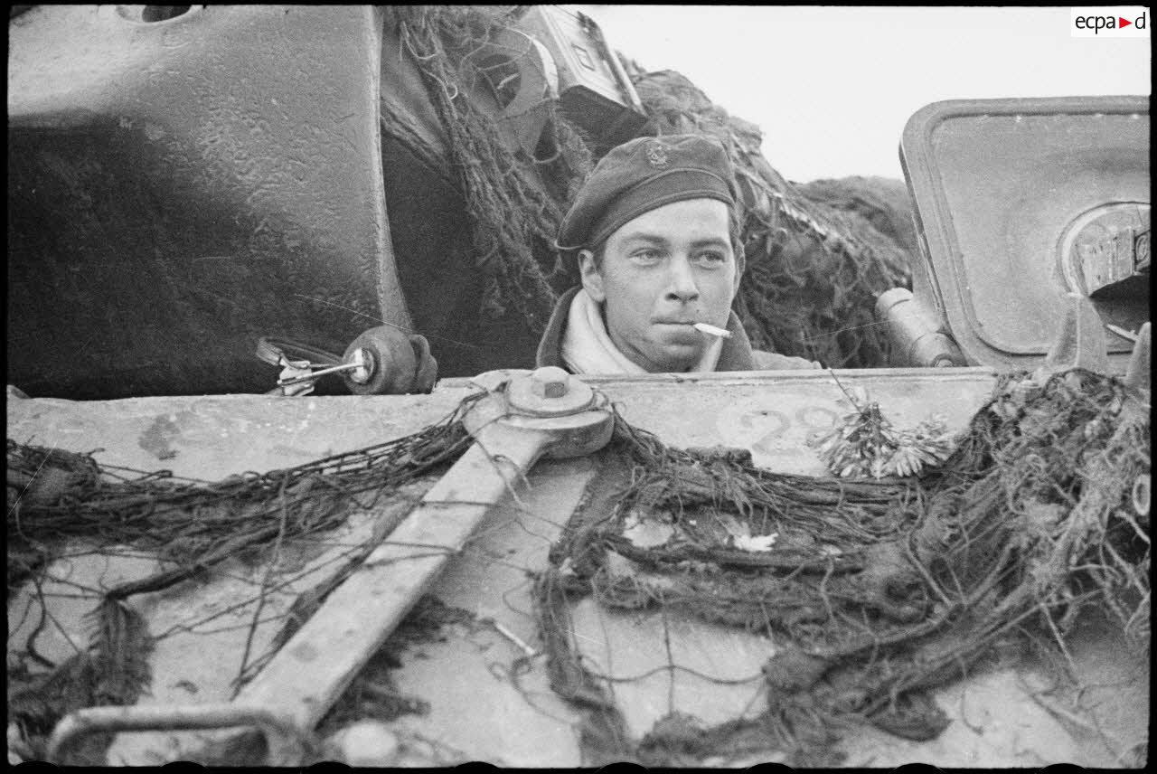 - Conducteur du tank destroyer TD M10 " Marsouin " du 2e peloton du 2e escadron du RBFM lors de la traversée d'une communes au sud-ouest de Strasbourg, probablement Blaesheim.