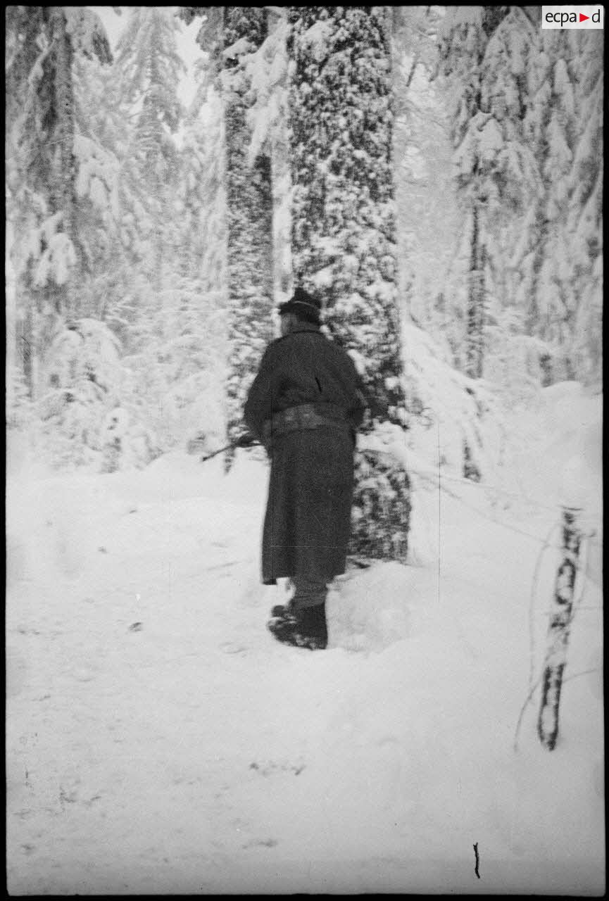 - Guet d'un soldat du 1er RFM (régiment de fusiliers marins) lors d'une patrouille de reconnaissance dans la forêt enneigée de Grattery dans les environs de Champagney (Haute-Saône).