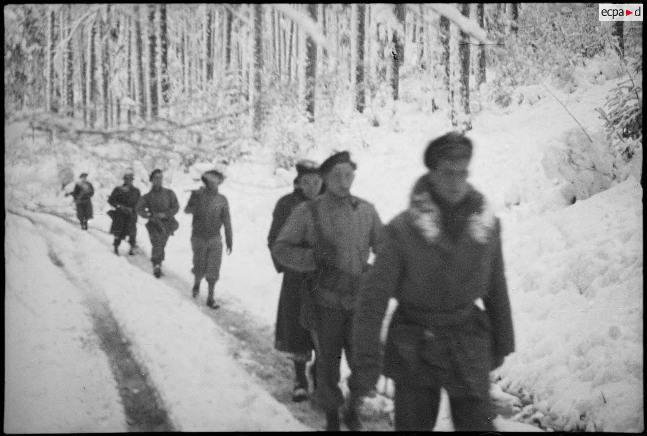 - Patrouille de reconnaissance par les hommes du 1er RFM (régiment de fusiliers marins), dans la forêt enneigée de Grattery, dans les environs de Champagney (Haute-Saône).