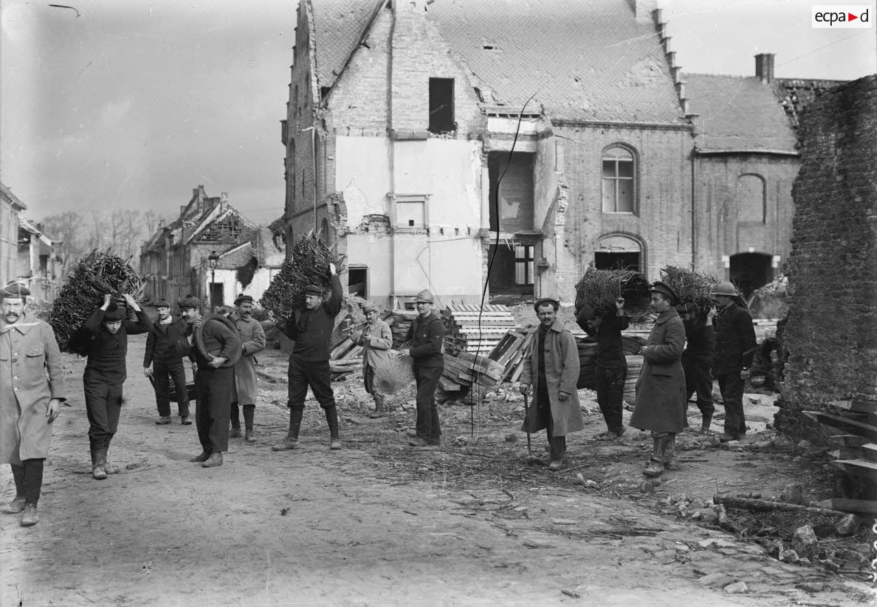 Nieuport (Belgique). Corvée de gabions par les fusiliers marins. [légende d'origine]