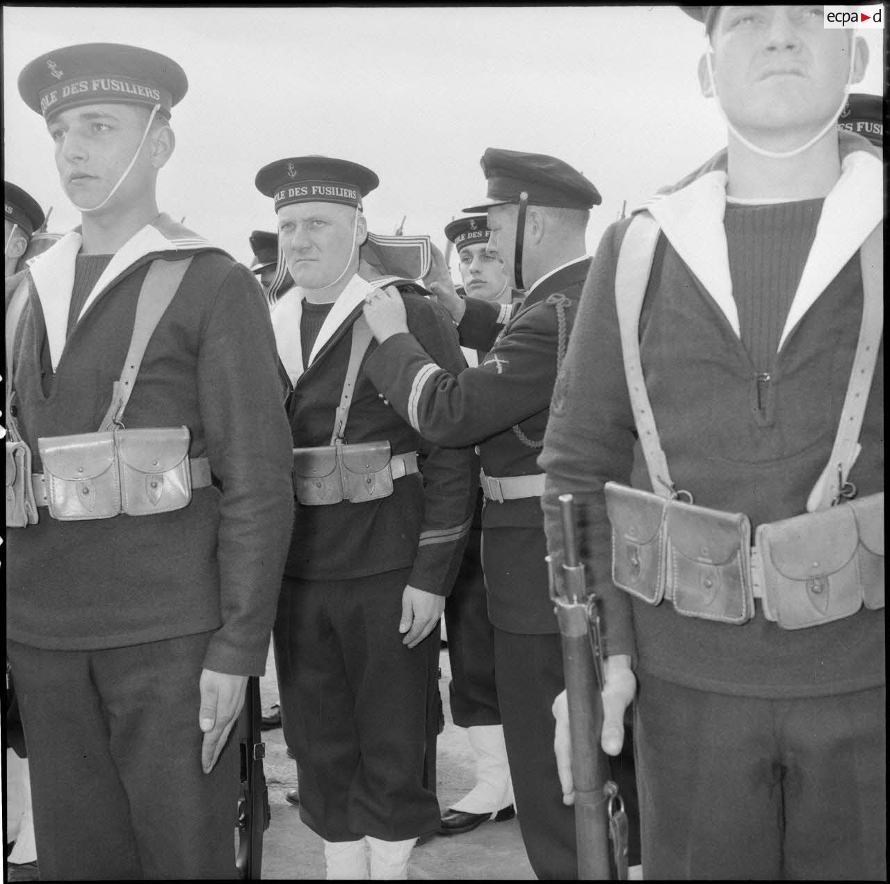 - Défilé des marins de l'école des fusiliers, le jour de la passation de commandement entre le général Lorillot et le général Salan.