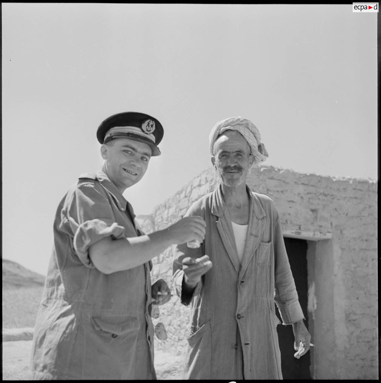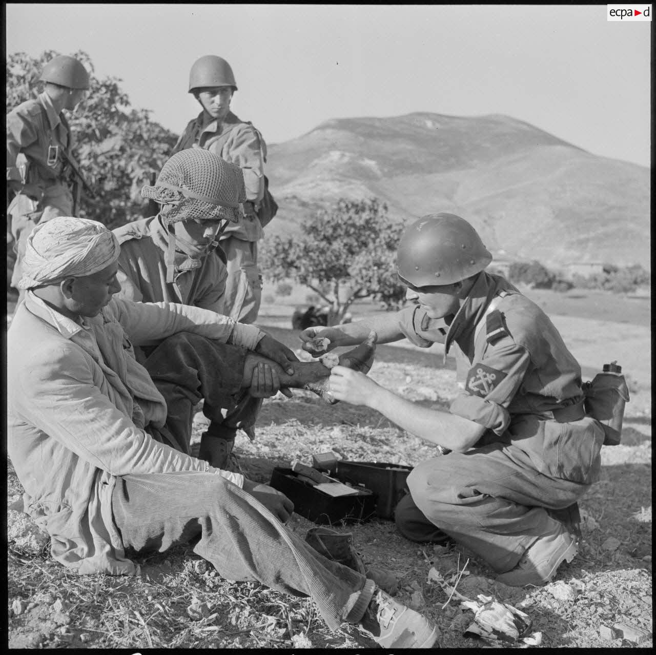 - Un aspirant infirmier du 2e bataillon de la 1re demi-brigade de fusiliers-marins (DBFM) soignant un habitant blessé.