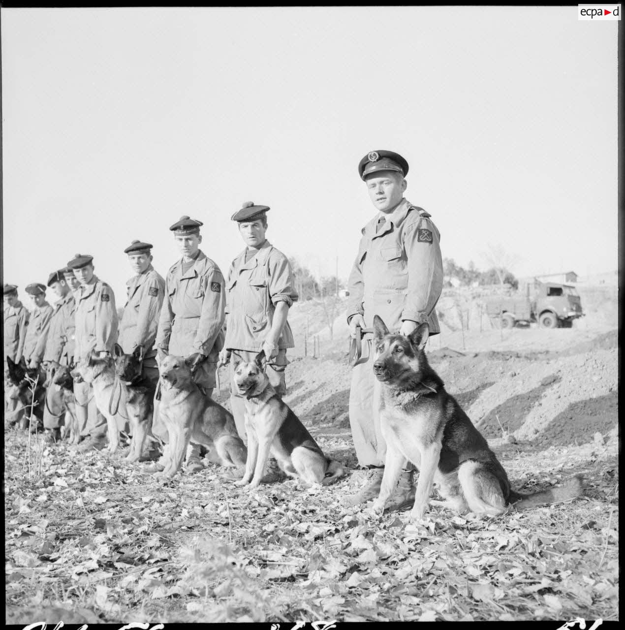 - Un groupe de fusiliers marins en rang avec leurs chiens près de la frontière algéro-marocaine.
