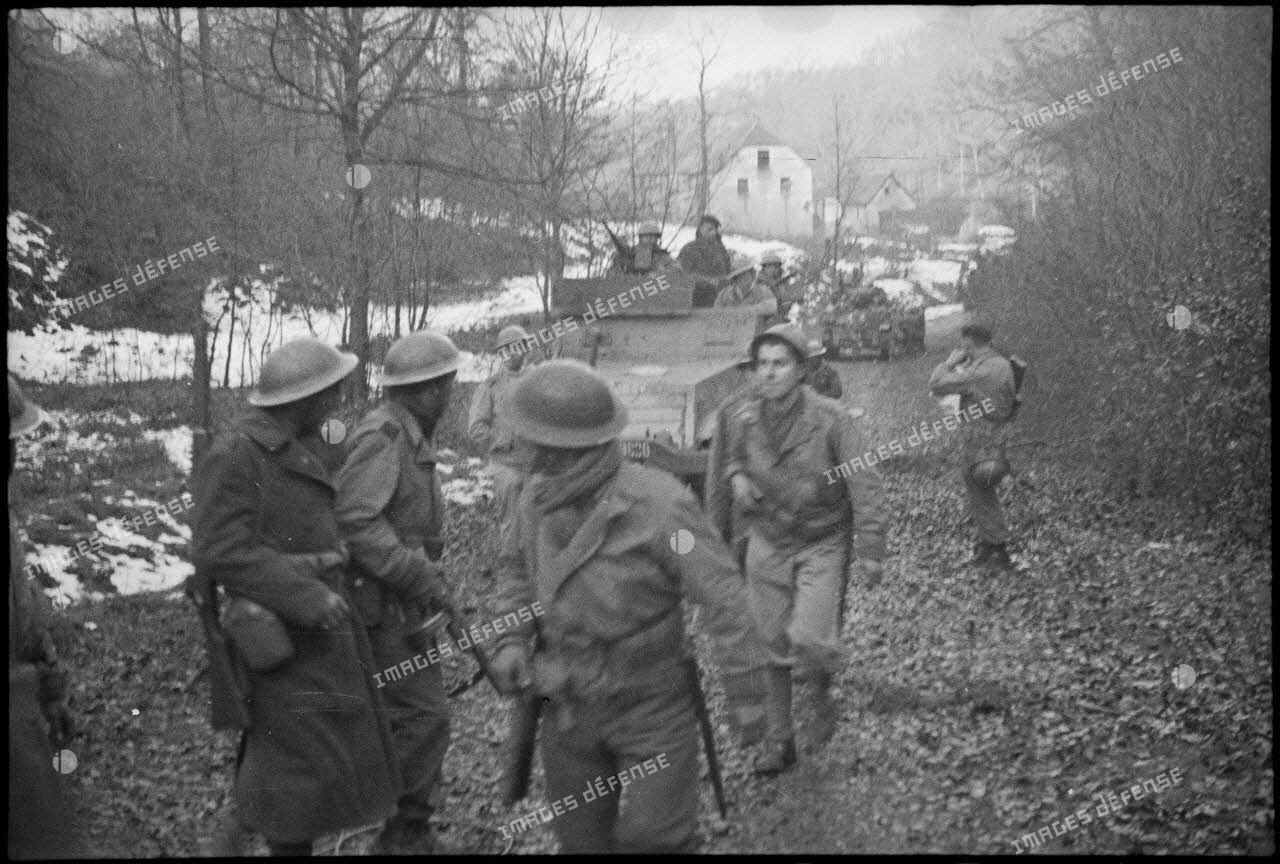 - Progression des fusiliers marins du 1er RFM (régiment de fusiliers marins), à pied et motorisés, sur les hauteurs dominantes au nord-est de Champagney (Haute-Saône).