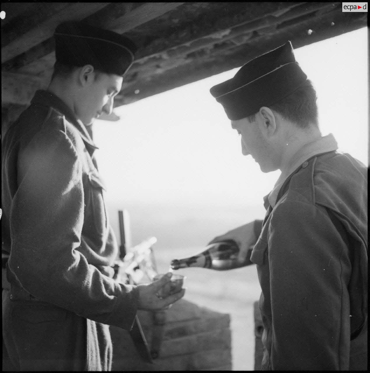 Les soldats positionnés dans des postes isolés doivent fêter Noël dans des conditions plus spartiates mais non moins sympathiques. Les soldats sont nombreux, aux côtés des infirmières et des femmes engagées, à assister dans les églises de campagne à la messe de Noël célébrée par les aumôniers militaires. Placé derrière l’autel, le drapeau français vient rappeler aussi bien le lien historique qui existe entre la religion catholique et la « fille aînée de l’Église », à une époque où la religion occupe encore une place importante dans la France, que le devoir des soldats envers leur patrie, y compris dans ce moment de recueillement où prévaut l’esprit de communion. Le lendemain, les frères d’armes se retrouvent autour d’un repas amélioré, tant que possible, pour trinquer tous ensemble.